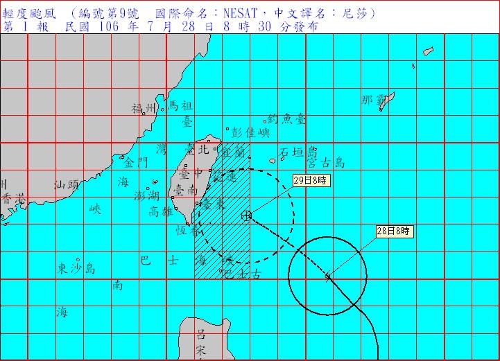 輕颱尼莎颱風逼近台灣,中央氣象局上午8時30分發布海上颱風警報。目前颱風中心位置位於鵝鑾鼻的東南東方約540公里海面上,以每小時16公里速度,向西北進行,近中心最大風速每秒30公尺(約每小時108公里),相當於11級風。氣象局提醒,暴風圈逐漸接近巴士海峽,沿海地區有長浪發生,並將有較強陣風,前往海邊活動請注意安全。