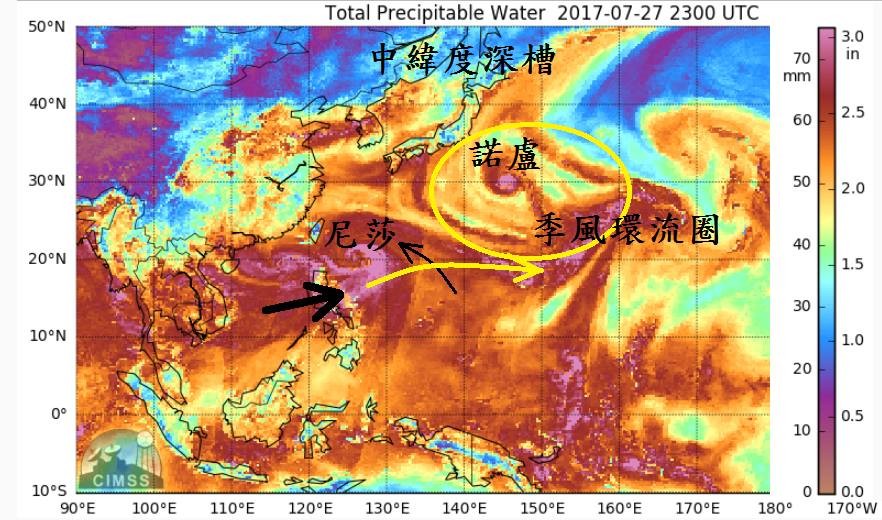 鄭明典則說,「大環境是季風環流圈的天氣型態,諾盧颱風是環流圈裡的擾動,季風環流圈的範圍比諾盧的環流大很多。」而現在一股很高溫潮濕的西南季風,由南海穿越菲律賓進入尼莎颱風的環流裡面,「是尼莎颱風對流發展很重要的水氣來源。」不過尼莎東側有一股相對較乾的氣流,也捲進尼莎環流,將不利增強。