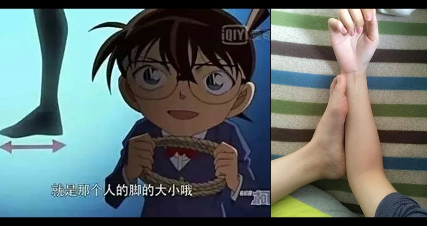 這幾天在「微博」上瘋狂出現一系列人體實驗,不少網友PO出自己腳底板緊貼手肘照片,更留下各種驚呼,「真沒騙我」、「真的是這樣」。原來,近來《名偵探柯南》動畫中有段劇情,柯南正在解釋嫌犯作案手法,他手中拿著一條繩子比劃,「因為手肘到手腕的長度,就是那個人的腳大小哦。」
