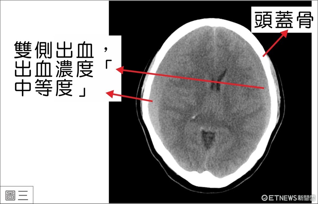 江明哲醫師表示:「這種兩側發生血腫的病例,有時很難早期被發現。其症狀就像感冒一樣,頭痛、嘔吐、身體乏力、步態不穩、頭頸部僵硬。在電腦斷層檢查中,濃度高的血水會呈現白色彎月狀影像,很容易被發現而接受手術治療。但是陳女士的出血濃度是「中等度」,同時又在顱內兩側發生,電腦斷層就不容易區別而被忽略(圖三)。」經詳問陳女士家屬,得知陳女士在住院前六個月,因跌倒而頭部受到撞擊。