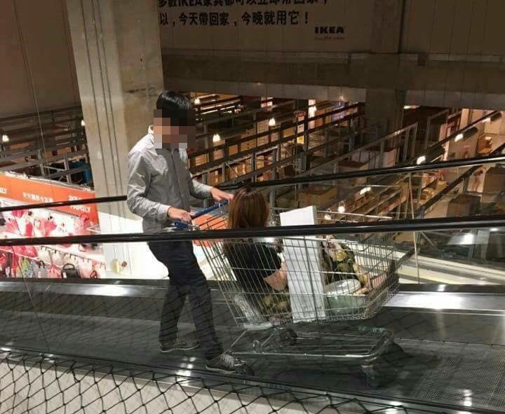 男網友於爆料公社發文,「這位男士展現體貼的一面,只是場景不對吧?!」照片中可見,一名穿著襯衫的年輕男子,推著購物車搭乘手扶梯,但是車內裝著的「貨物」,竟然是一名成年女子,行徑令人傻眼。