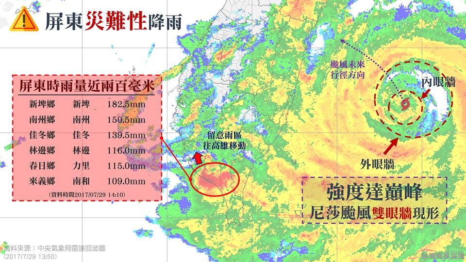 中颱尼莎持續逼近台灣,下午14時30分中心位置位於花蓮東南東方約140公里海面上,以每小時20轉15公里速度,向西北轉西北西進行。台灣颱風論壇指出,尼莎颱風出現雙眼牆,表示颱風強度已達顛峰,路徑持續偏北,北台灣威脅增加,目前屏東也出現災難性降雨,時雨量將近200毫米。