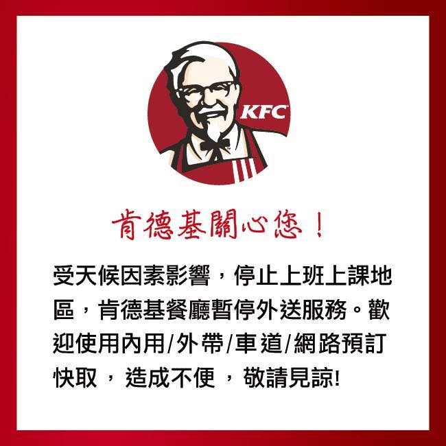 肯德基在臉書上指出,為保障外送服務人員人身安全,如遇上地方縣市政府宣布停止上班時,肯德基該縣市門市將暫停外送服務;若該縣市未宣布停止上班上課,但風雨狀況不適宜,各店也會視情況暫停外送服務,僅保留內用、外帶、車道和網路預訂快取服務。另外停班停課縣市的餐廳,將視情況提供部分限定餐點。