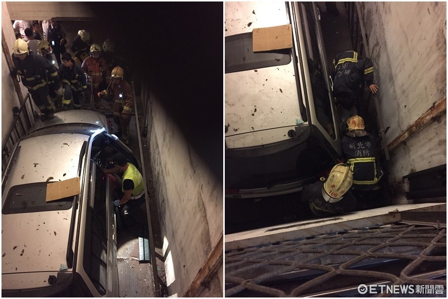 ▲新北市蘆洲區一處停車升降梯疑似機械平台故障,一輛汽車直接從1樓墜落至地下1樓。(圖/翻攝畫面,下同)