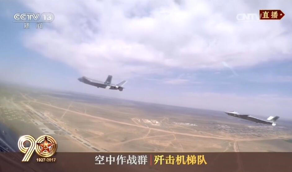 ▲慶祝解放軍建軍90周年閱兵式,3架編隊飛行的殲-20都在機腹額外掛載龍勃透鏡。(圖/翻攝自央視)