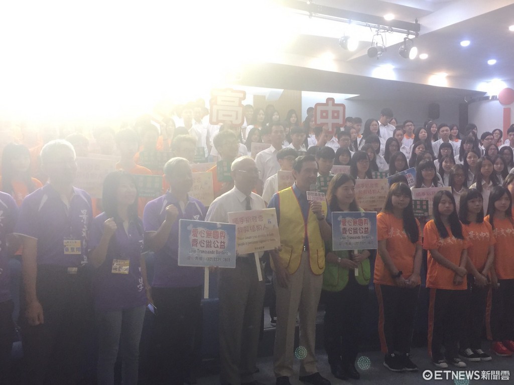 ▲馬英九與學生一起唸「順手捐發票、救救植物人」英、日、韓版。(圖/記者張暐珩攝)