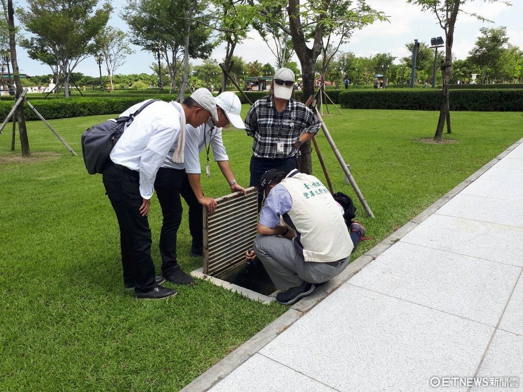 ▲台南市登革熱防治中心陳怡主任,率員於台南都會公園及奇美博物館周邊環境,進行登革熱孳生源聯合稽查。(圖/衛生局提供)