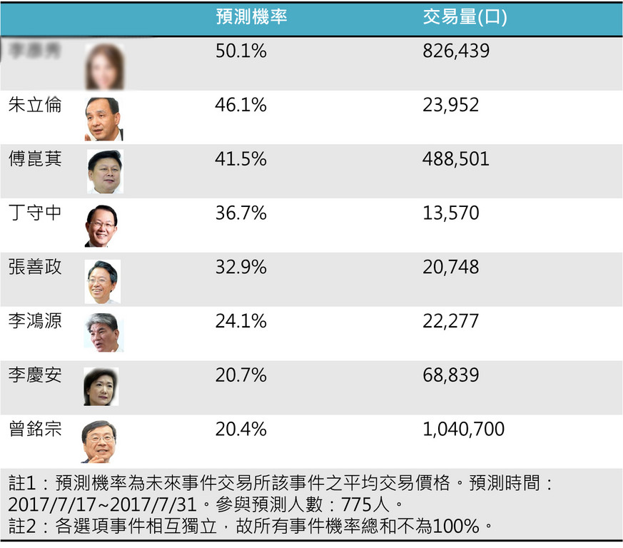未來事件交易所指出,從交易量來看,李彥秀、傅崑萁、曾銘宗三人的較易量都很高,顯示市場對於這三人是否代表國民黨參選的看法最為分歧。
