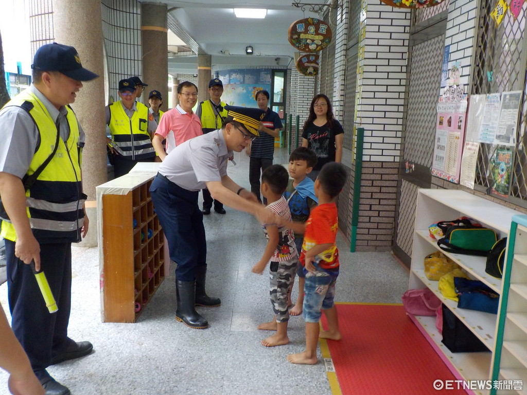 幼童家長知道玉井分局分局長楊華中前來關心,特別覺得溫暖窩心,小朋友都不怕生跟楊華中分局長親切互動。楊華中分局長也轉達賴清德市長關心民眾之意;玉井國小校長江隆安特別感謝警察在風雨中貼心地服務。
