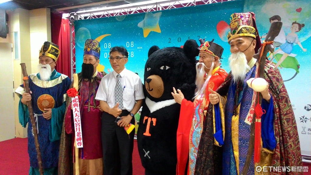 ▲台灣觀光大使「喔熊組長」,前來台南,特別與台南市7間月老廟的月老神偶攜手站臺,力推台南七夕愛情嘉年華的文化與浪漫。(圖/文化局提供)