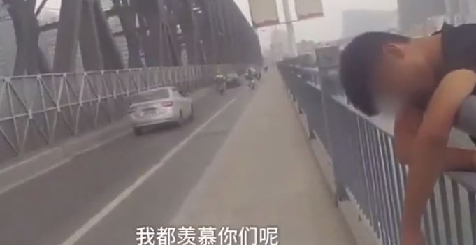 中國《梨視頻》Youtube頻道上傳這則影片。從畫面中可以看到,一個瘦弱的男子掛在一個橋上,底下就是滾滾河水,他因為感情問題和與家人發生爭執,在鬧自殺。
