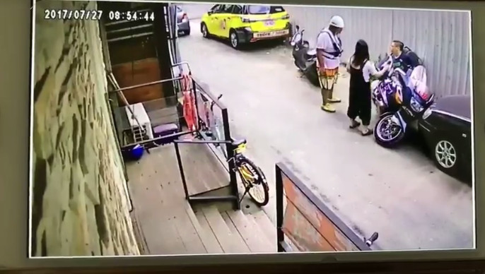 女子見狀立刻上前幫忙,但2人合力也拉不動重機,女子便急忙到附近找人幫忙。沒過多久,女子和一名頭戴工程帽的壯碩男子走回來,卻沒想到這名壯男就是車主本人。