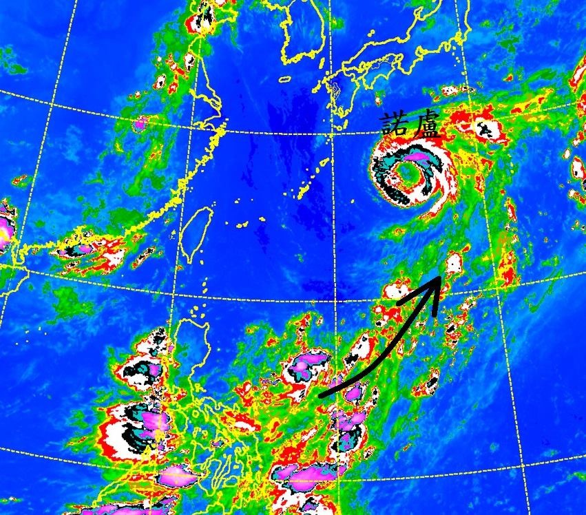 鄭明典表示,諾盧現在的對流有點偏弱,但是環流已經連接到南方來的水氣帶,加上慢慢移入海洋熱容較大的區域,預期今天開始它又會再度增強,而且雲系範圍會明顯擴大,日本南部最應擔心諾盧的發展。