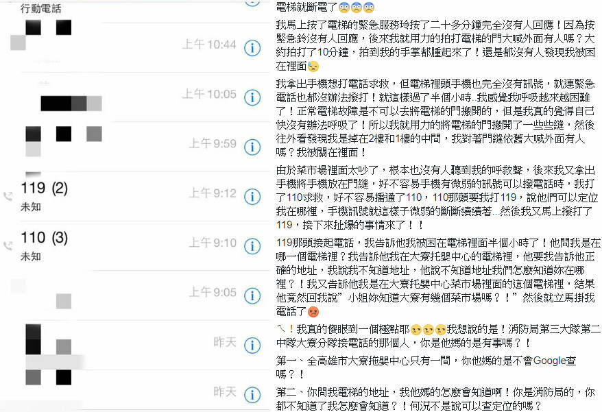 女網友撥通後,表示自己被困在大寮托嬰中心的電梯裡,對方接著問她確切地址,但她根本不知道,結果竟得到不耐煩的回應,「不知道地址我們怎麼知道妳在哪裡?小姐妳知道大寮有幾個菜市場嗎?」然後就掛電話了。