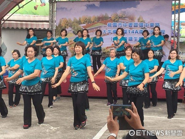▲中原大學14A滯洪池工程開工典禮,社區婦女熱情歌舞慶祝。(圖/桃園市政府提供)