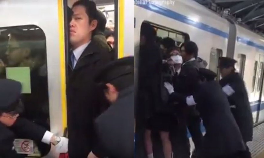 影片拍攝時間大約在2016年底,拍攝者是在日本東京生活了8年多的義大利攝影Marco Patella。影片中可以看見,車廂門外2名男女正要擠上車,但車廂內根本已爆滿進不去,兩人只能硬著頭皮往內塞,幾秒後女子苦著臉放棄,但男子堅持要上車,地鐵人員只好大力幫忙推,費了好大功夫才順利把門關起來。