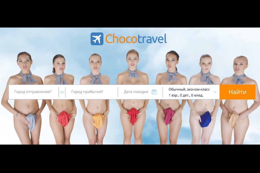 在這之30秒的廣告中,一開始先特寫女演員們肩膀以上,看起來就空服員沒什麼兩樣,但鏡頭拉遠之後,她們全都是裸體,胸部用字卡擋著,下半身則是只有一頂小帽子遮住,畫面超火辣,台詞說道「Chocotravel不會向你索取任何不需要的東西」。儘管受到許多批評,這間旅行社仍在隔天再度推出另一支男性版的廣告,概念很類似,影片中的男演員也是只有領帶和機長的帽子,其餘都是裸體。