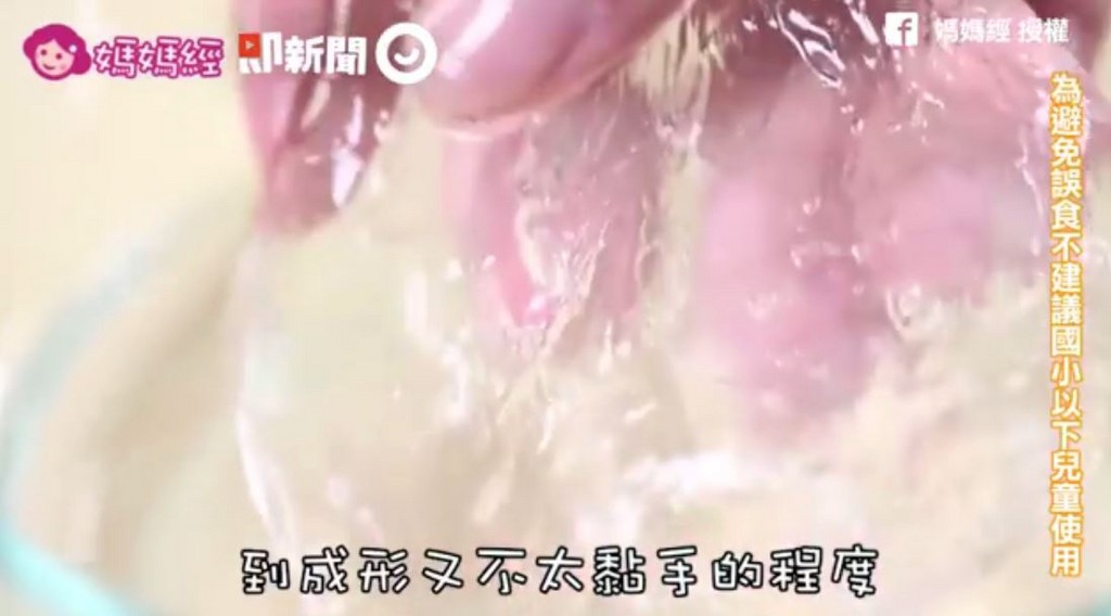 做法相當簡單,首先先取300ml溫水,加入1匙硼砂,攪拌均勻,再將整罐的膠水到入攪拌碗裡,接著加入150ml的溫水,同樣攪拌均勻;之後再將兩碗到再一起,最後用手攪拌製成型即可!