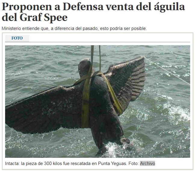 二戰期間自沉於烏拉圭港口的納粹德國「施佩伯爵海軍上將號」(Admiral Graf Spee)裝甲軍艦,艦艉上的「黨之鷹」(Parteiadler)雕像2006年被民間公司打撈上岸,隨後轉由烏拉圭政府保存至今。日前傳出烏國海軍有意出售這座抓有「卍」字的老鷹,希望籌取部分軍費。