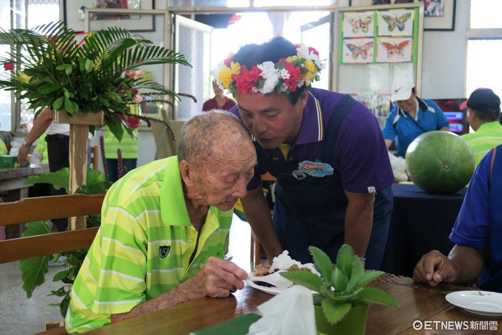 ▲台東卑南鄉鄉長許文獻到各日托站歡慶父親節,參與矇眼吃布丁遊戲,逗樂了日托站長輩。(圖/卑南鄉公所提供 下同)