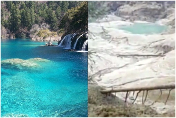 四川九寨溝8月8日晚間發生7.0地震,當地多處觀光景點受損,包括著名的「火花海」受影響嚴重,原先湛藍色水體嚴重流失,水底泥土裸露,絕美景象變得一片狼籍。