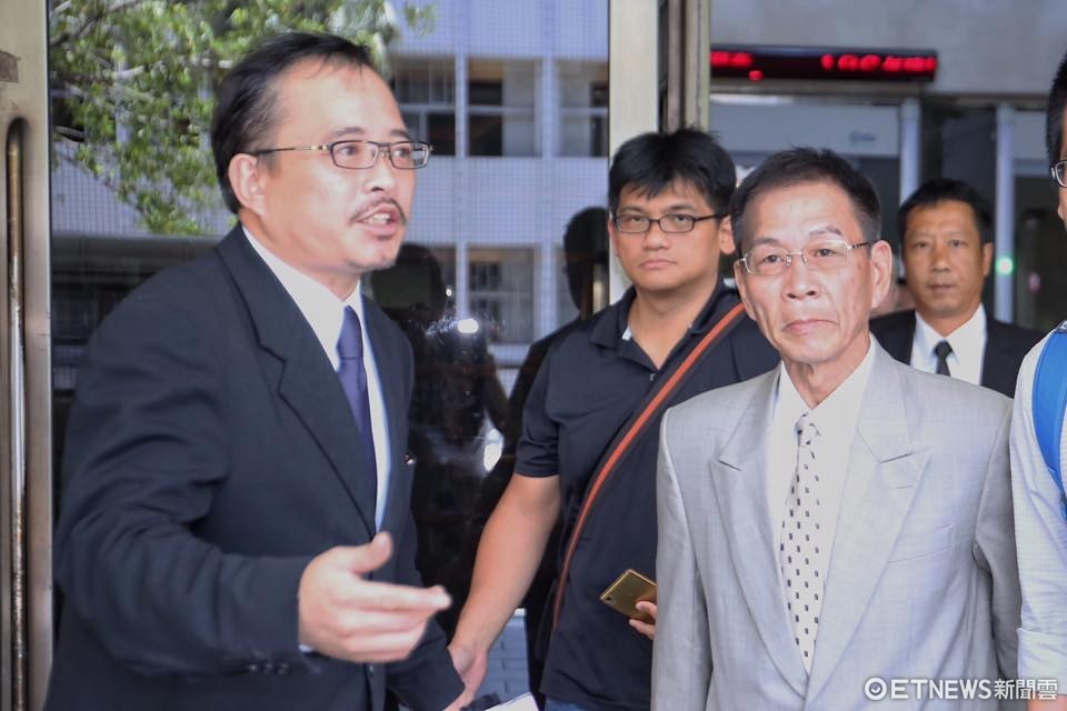 ▲翁炳堯(右,灰西裝)自首當年槍擊案作了偽證,檢察官將他限制住居後請回。(圖/記者周宸亘攝)