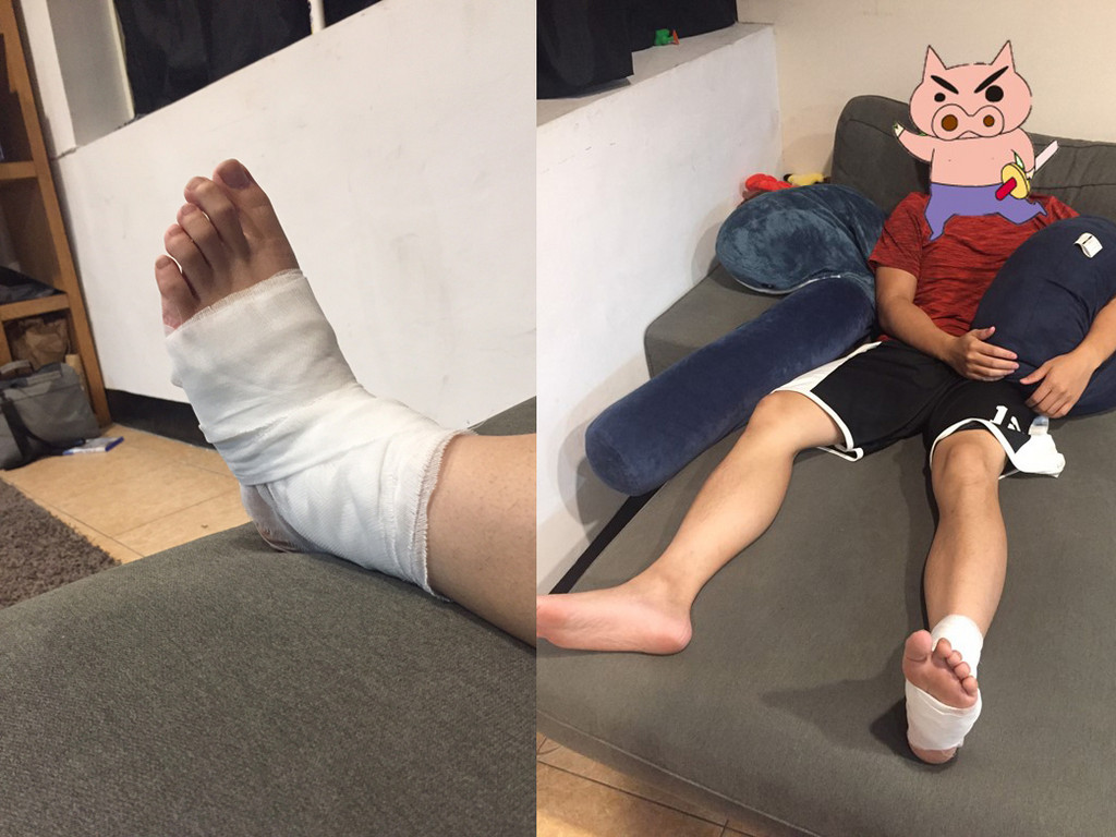照片裡,原PO男友腳上綁著繃帶,根本就無法行動,害原PO還要晚上撐著一隻大肥豬來回移動。她說「還好樓下就是國術館,男友又剛好穿球褲,急中生智拿了顆籃球下樓,醫生就沒問他怎麼受傷的,不然我絕對答不出來啦!」