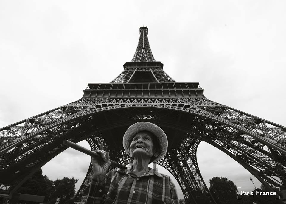 照片中可見,母親站在法國巴黎鐵塔下望著天空,黑白照片復古有韻、站在人來人往的日本街頭,撐著一把繽紛的粉紅點點傘,俏皮又可愛、穿著白色羽絨衣靠在威尼斯的古橋旁,表情耐人尋味,雖然僅是合成照,卻流露出自然真情,令人為之動容。