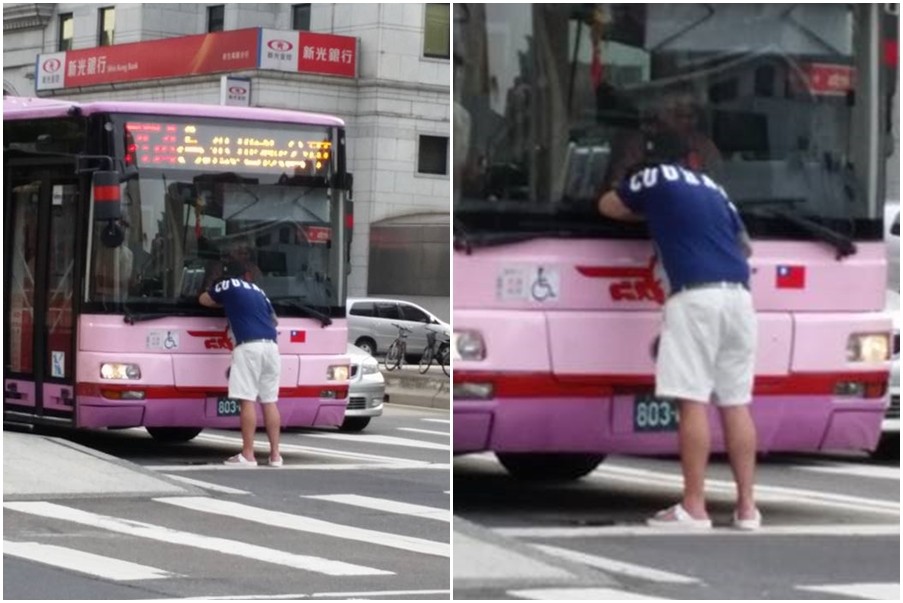 民眾11日早上7時趕著通勤上班上學,公車行經路口途中竟然有一名男子上前「壁咚」,車上乘客見狀全傻眼。路過的網友甚至將照片上傳至《爆料公社》,只見一名男子直接趴在公車的擋風玻璃前,讓公車根本動彈不得。