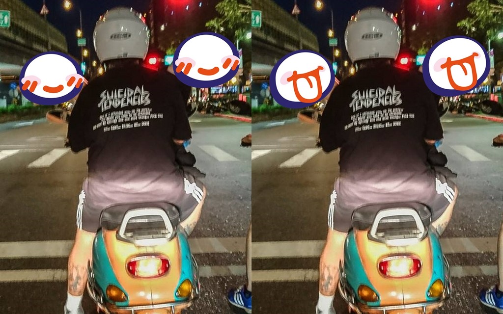 原PO表示:「騎車載女友兜風是很美好的,但這一姿勢猛然一看真的嚇到,剛吃完晚餐的我……。」最後也附上一張圖片說,拍攝地點在台北市建國南路。照片中可以看見,騎士等停紅綠燈時,肩膀上掛著疑似充氣娃娃(假人偶)的雙腳,猛然一看就像是在「69式」騎車。