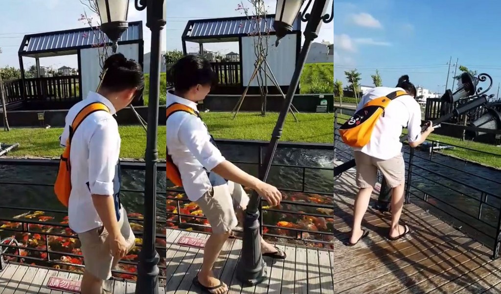 走路要看前面啊,免得把路燈撞彎了…。臉書社團「爆廢公社」12日有一名網友PO文表示,自己跟家人到風景區散步時,弟弟買了飼料邊走邊餵魚,結果竟然意外把路燈撞倒,讓他當場趴在地上狂笑。