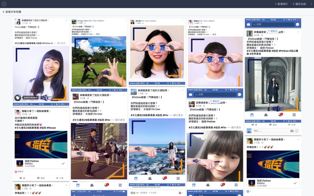 中國文化大學廣告學系29屆畢業展「指控」(Fin Con),大玩互動創意哏,號召系上所有師長與近200位同學,13日中午12點,在臉書更換以手指為創意的「大頭貼特效框」,並在粉絲專頁釋出臉書最新功能「Live Photos動態照片」,創新的互動式手法,引爆網路討論!