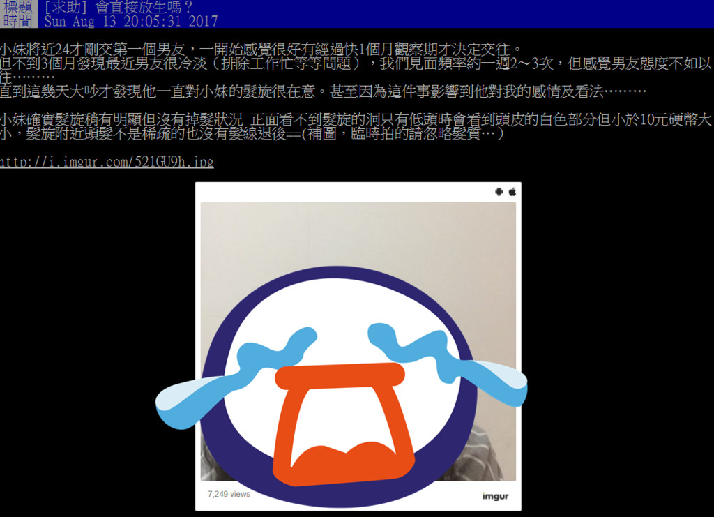 女網友表示,起初感覺很好,而且有經過1個月的觀察,才決定和對方交往,但最近她發現男友很冷淡、不如以往,每個禮拜見面也只有2到3次,而這幾天的大吵,讓她發現原來男友一直對她的髮旋很在意,甚至因此影響到對她的感情及看法。