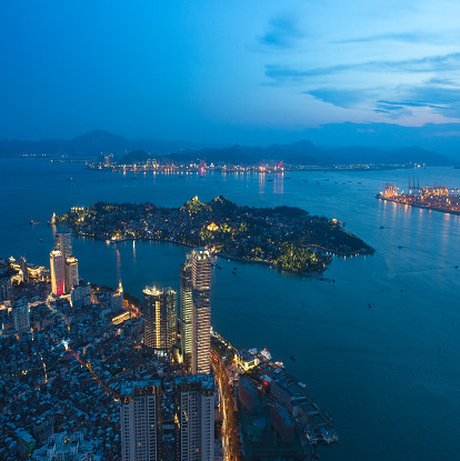 ▲廈門鼓浪嶼的燈火與對岸的現代建築夜景在晚霞的映襯下遙相輝映。(圖/新華社)