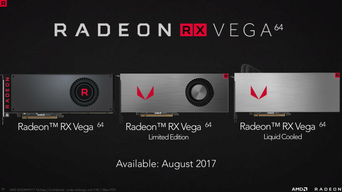 Radeon RX Vega 按照版本不同共分為 Radeon RX Vega 56 / 64 兩種版本,台灣首波販售的產品為 Radeon RX Vega 64(56 則是 8/28 上市),並細分一般空冷、限量空冷、水冷三款,其中兩款空冷的差別僅在黑色與銀色的塗裝不同。台灣售價 Radeon RX Vega 64 空冷兩款為 19,590 元,水冷版則售價 22,900 元,並可免費獲得《德軍總部2:新巨像》與《Prey 獵魂》兩款遊戲。