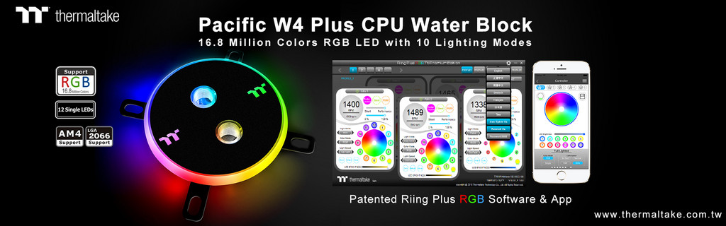 曜越推出 Pacific W4 Plus CPU 水冷頭,搭載呈現 1680 萬色彩光學的 LED 導光圈和 12 顆 LED 燈,擁有 11 種燈光效果,玩家可透過 Riing Plus RGB 軟體變換燈光,創造與眾不同的散熱系統。