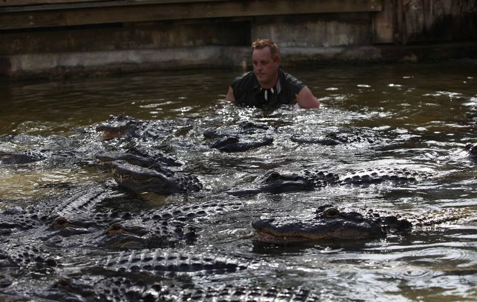 佛羅里達州野生動物專家麥可(Michael Womer)不懼危險,跟20多隻短吻鱷一起游泳,令人不禁幫他捏把冷汗。畫面中,他在下水前先和鱷魚們自拍,後來從容不迫的下水,甚至還親吻其中一條鱷魚的尾巴,最後餵完飼料後,才游上水面。