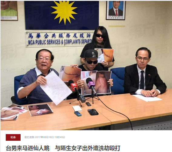 一名來自台灣的30歲牙醫在今年7月中旬前往大馬與女友會面,期間因與女友發生口角,一氣之下利用微信與一名陌生女子結識。兩人相識不久後,便在車上擁抱和接吻,不料在親熱時,遭3名印裔男子上車毆打,縫了52針,還被奪走手機、金項鏈等。他因在打劫過程中沒聽見陌生女子的呼救,懷疑自己遇到仙人跳,便在女友的陪同下找當地議員召開記者會公佈此事。