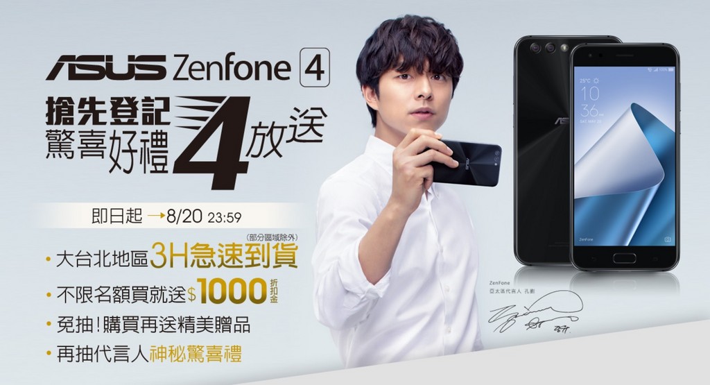 華碩今(8/17)舉行ZenFone 4系列手機發表會,東森購物網當天同步開賣,並於20日前限時推出網購預約活動,搶先登記預約並於開賣後完成訂購與付款,即可享雙北地區3小時內到貨、ASUS原廠獨家贈品、1,000元折扣金,另可再抽孔劉人型立牌;此外,東森購物也將於晚間22:00第47頻道、MOD第37頻道舉行電視購物Live獨家首賣,隨貨將贈送ASUS原廠獨家好禮以及代言人孔劉的搶手禮物。