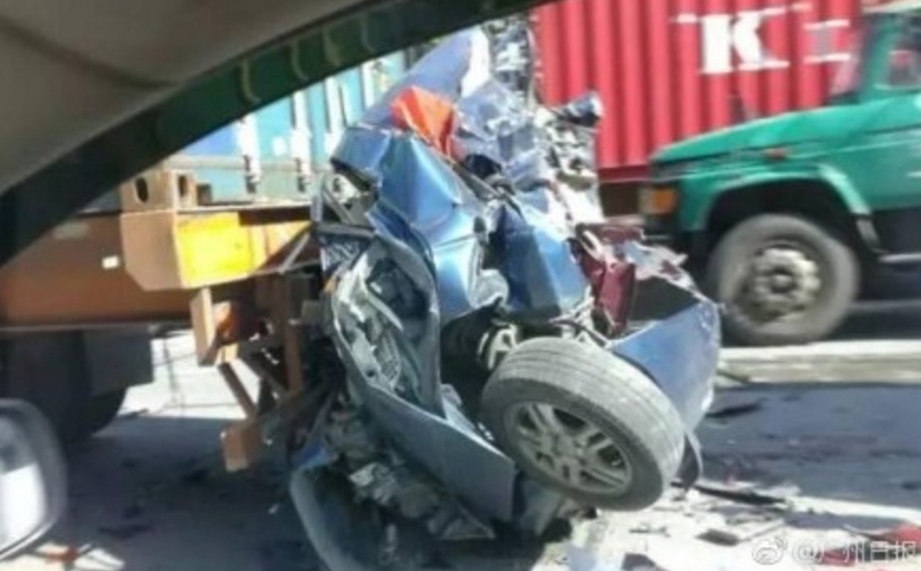 據《廣州日報》報導,當時後方的紅色大貨車直接撞上藍色轎車,讓夾在貨車間的轎車1秒成為「一團廢鐵」,紅色貨車在把轎車擠壓成「鐵球」後又直直撞上藍色貨車,汽車上的駕駛及乘客當場死亡,4輛車受到不同程度的損毀。