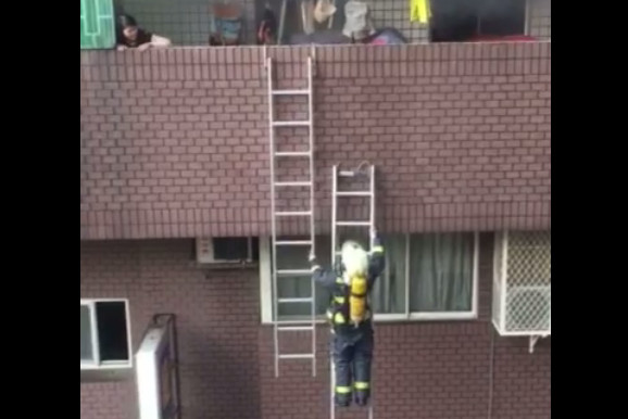 台中市北屯區日前一處公寓發生火警,導致一名女子受困在4樓陽台,然而消防員身穿25公斤裝備,扛著7公斤重的掛梯,爬上4層樓高,臨危不亂地掛好梯子,並請受困民眾一步步爬至地面,只要稍有閃失就會發生意外,但消防員仍成功完成救援任務,影片被上傳到社群網站後也廣受好評!