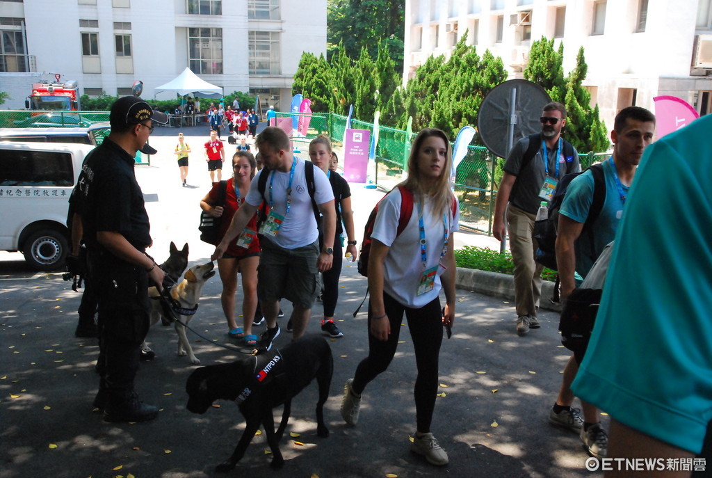 台北世界大學運動會正式開幕,備受國人期待的舉重項目今(20日)上午9時許也在淡江大學紹謨紀念體育館點燃戰火。淡水警分局面對大型國際賽事不敢大意,今清晨6時商請新北市政府警察局警犬隊派出3隻警犬到場協助場內、外安全檢查。許多外國選手及教練看到認真工作的防爆犬,紛紛上前拍照留念。