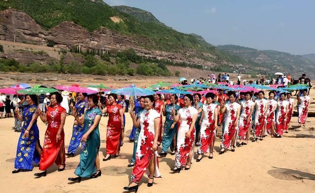山西吉縣老年大學旗袍隊隊員在黃河壺口瀑布前展示旗袍。當天,來自山西吉縣老年大學的50多名學員,身上穿著不同花樣及顏色的旗袍,在黃河壺口瀑布景區進行展示,傳統服飾與壯麗的瀑布交相輝映,別有一番景致。