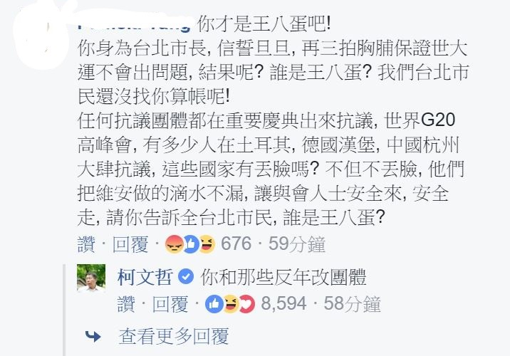 反年金改革團體日前在世大運開幕當天,出現在會場抗議,導致上百名選手無法順利入場,對此,台北市長柯文哲痛批抗議民眾「王八蛋」引來爭議,更有網友在柯P的粉絲團嗆「你身為台北市長, 信誓旦旦, 再三拍胸脯保證世大運不會出問題,結果呢?請你告訴全台北市民,誰是王八蛋?」結果得到的回覆是「你和那些反年改團體」。