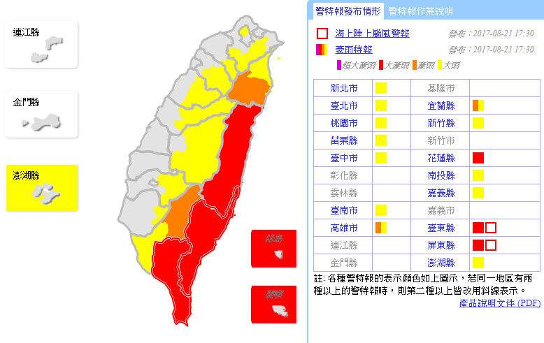 氣象局指出,天鴿颱風暴風圈預估明(22)日清晨觸陸,明上午是影響台灣最劇烈的時間。受到外圍環流逼近影響,今(21日)晚至明(22)日氣象局針對台東、花蓮、屏東地區發布大豪雨特報;宜蘭山區、高雄山區有局部大雨或豪雨;南部地區、中部以北山區及澎湖有局部大雨發生的機率,要注意坍方、落石、土石流。