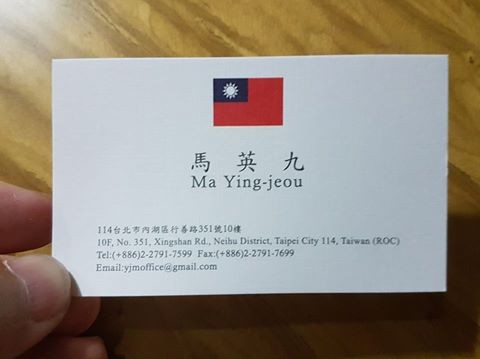 而馬英九名片中並沒有印上任何頭銜,只有中央的「馬英九」中英文名,以及上頭的中華民國國旗。底下則是馬辦地址、電話與電子郵件。