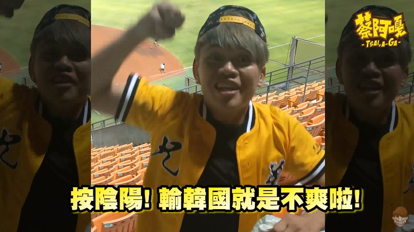 「我們也加油啊,繼續打第五名啊,就是輸人家,技不如人,真的不知道要罵什麼。南韓恭喜啦,但是又輸南韓…」,蔡阿嘎突然爆氣,「按陰陽,輸南韓就是不爽啦」、「就是不爽,O」。