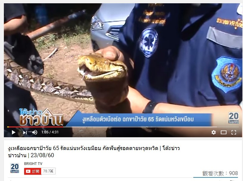 泰國紅統府猜唷縣(Chaiyo)一名65歲大媽在自家院子險遭4公尺長的蟒蛇活吞,由於左腳被緊緊地纏住,讓她費了好大一番力氣才搬開蛇口並順利逃脫,筋疲力盡的她最後被家人發現,送醫治療後已無大礙。
