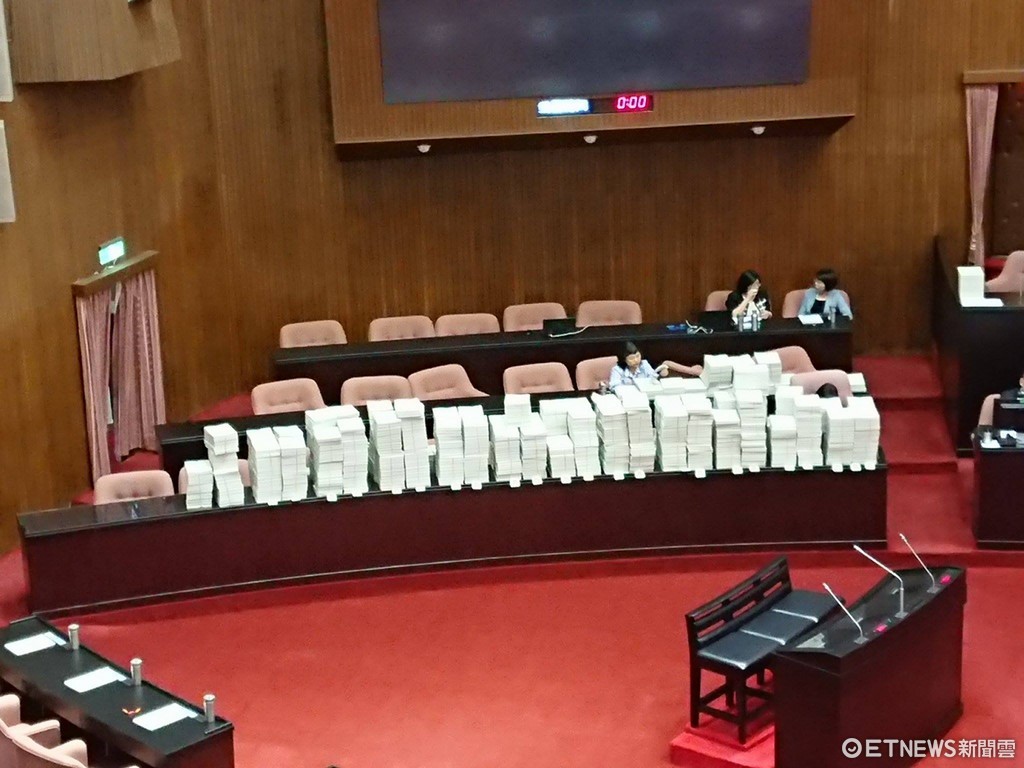 ▲上萬份前瞻預算提案堆滿議場桌上。(圖/記者翁嫆琄攝)