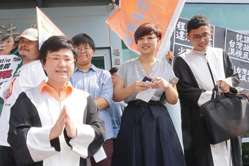 ▲台北高等行政法院針對女同志呂欣潔與陳凌登記結婚遭拒案開庭審理,呂欣潔與律師呼籲應速完成同婚立法。